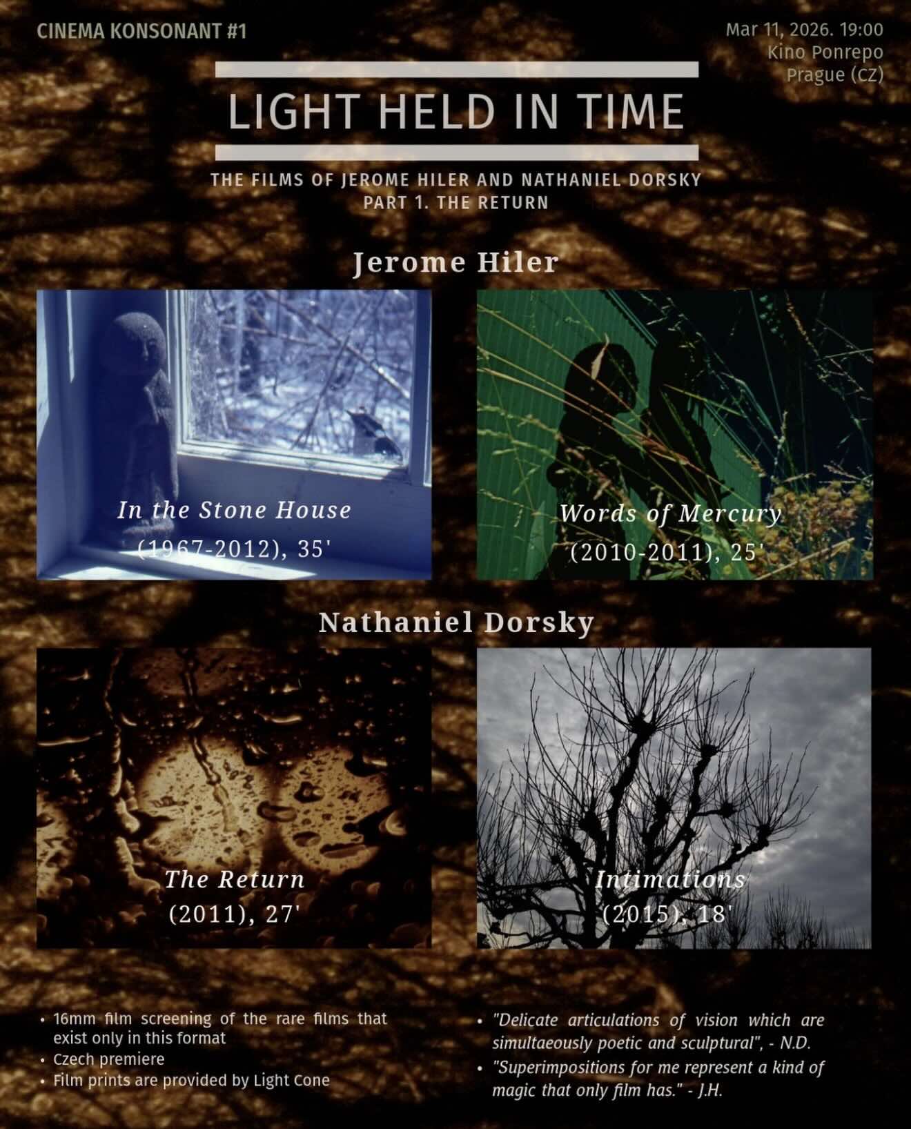 Trvalo téměř půl století, než se filmy Nathaniela Dorskyho a Jeroma Hilera dočkaly odpovídajícího uznání a širší pozornosti. U obou započalo jejich umělecké hledání ve Spojených státech v šedesátých letech 20. století. Osobně vedeni Gregorym J. Markopoulosem a silně ovlivněni tvorbou Stana Brakhage, Rona Rice, Marie Menken a dalších rozvinuli jedinečný subžánr fotografických, převážně vizuálních filmů, v nichž je percepce formována se stejnou citlivostí k rytmu, světlu a trvání a nabývá zároveň lyrického i sochařského charakteru.